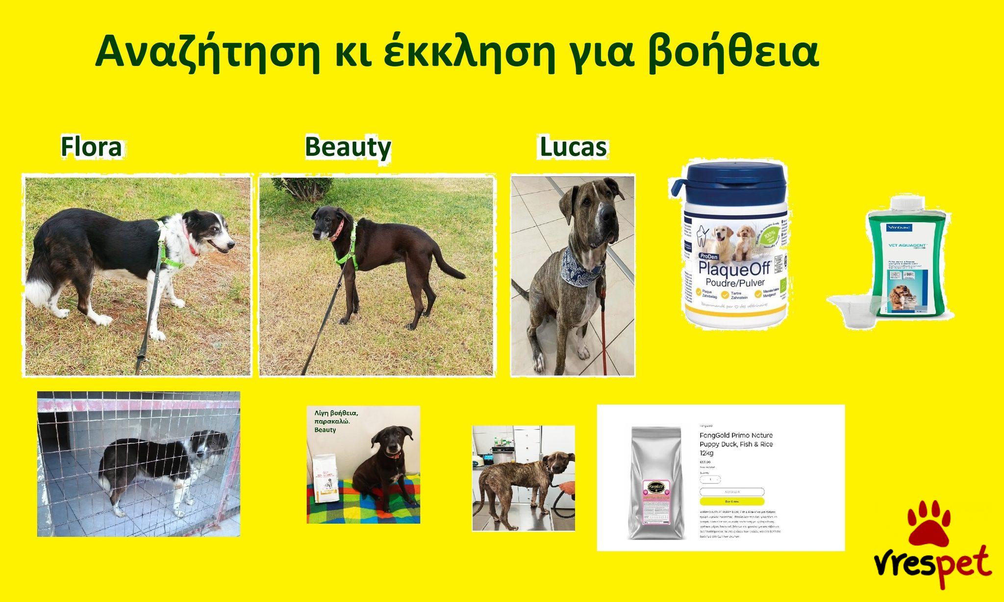 Η ολιγομελής 7μελής ομάδας μας, λόγω πολλών εξόδων κι αδυναμία να αντεπεξέλθει στις υποχρεώσεις και έξοδα για τα 3 σκυλάκια μας (Φλώρα, Beauty και Λουκά) κάνει έκκληση βοήθειας.