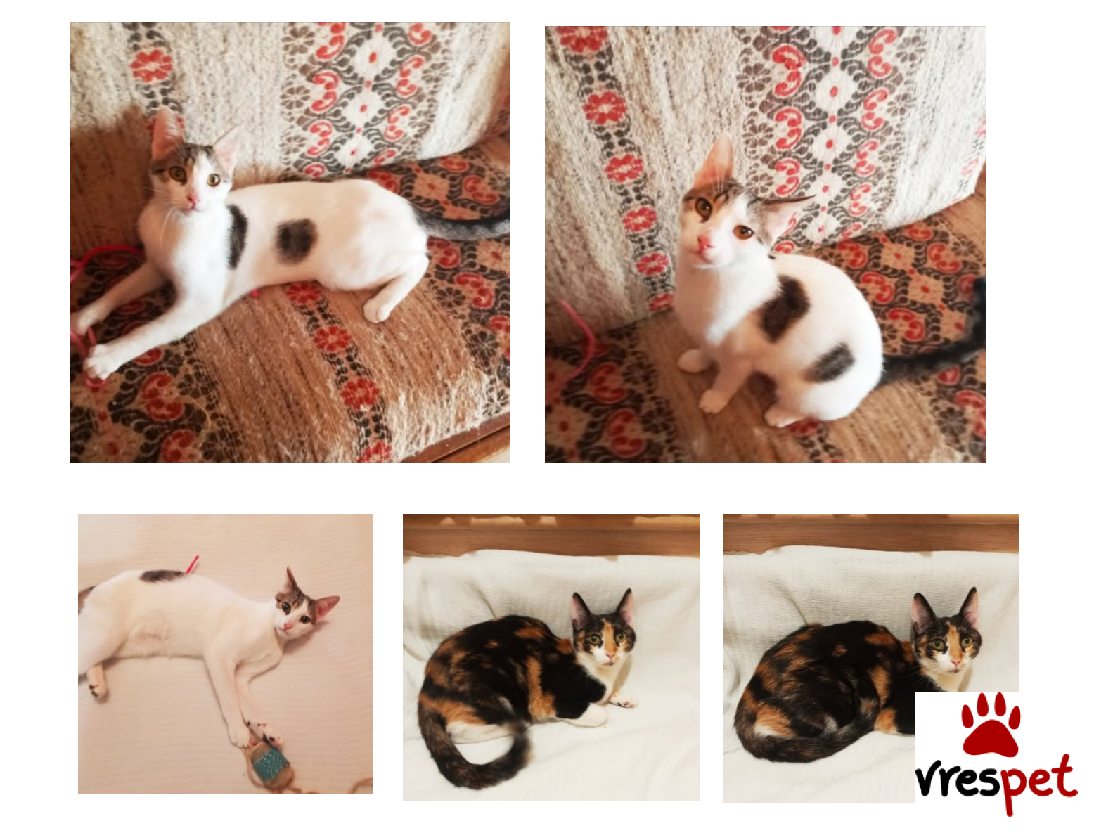 Μας λένε Μάφιν (πολύχρωμη) και Βανίλια (λευκή). Είμαστε δυο αδελφούλες, θηλυκές γατούλες, 7 μηνών. Είμαστε φιλικές, παιχνιδιάρες, φιλικές με άλλα γατάκια. Τρώμε ξηρά τροφή και κάνουμε την ανάγκη μας πάντα μέσα στο αμμοδοχείο. Είμαστε εμβολιασμένες, με βιβλιάριο υγείας, ηλεκτρονική ταυτότητα και τον επόμενο μήνα θα είμαστε και στειρωμένες, καθώς η στείρωση είναι καλή και προστατεύει τα θηλυκά γατάκια ( και θηλυκα σκυλάκια) από καρκίνο, ψευδοκύηση και πυομήτρα.