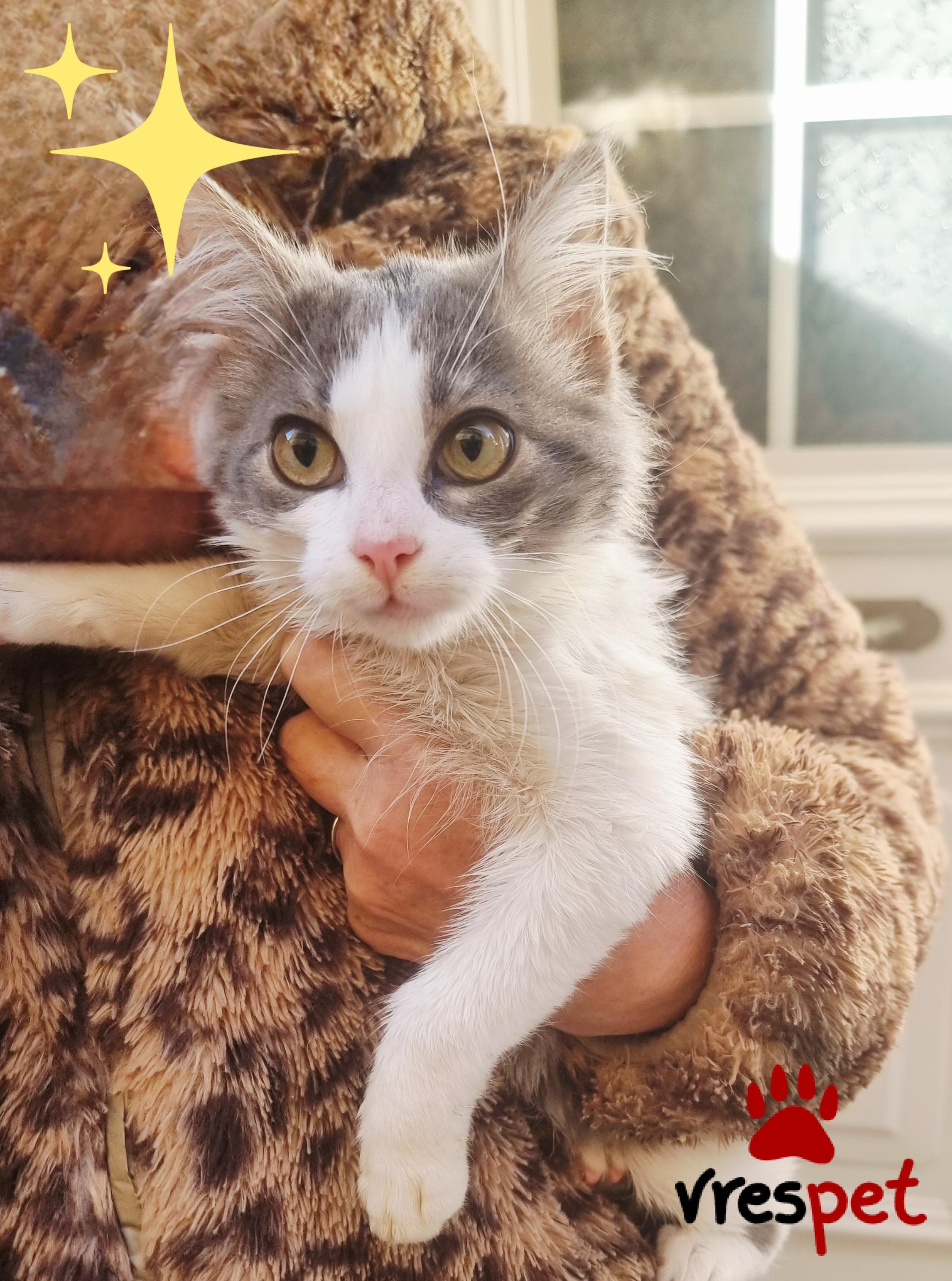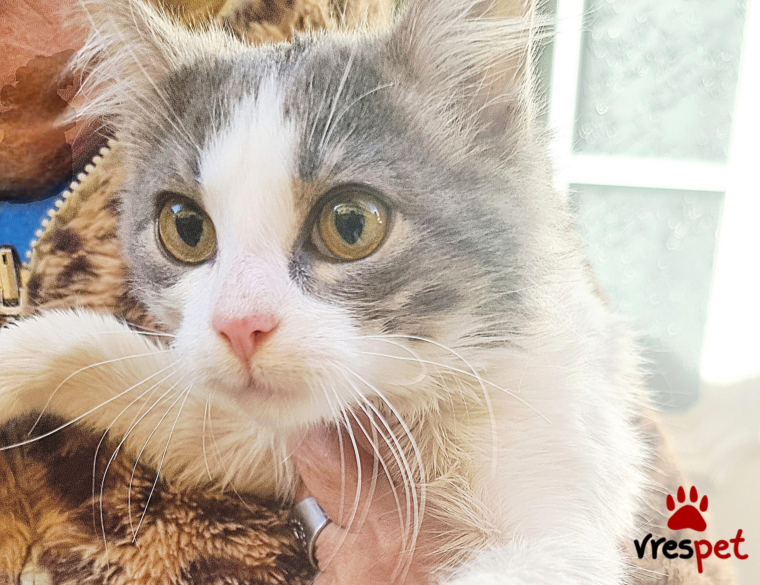 Ασπρόγκριζο μακρυτριχο γατάκι, με μοναδικο προσωπάκι και παιχνιδιάρικη καρδιά, ψάχνει το δικό του παντοτινό σπίτι. Είναι κοινωνικό, ήρεμο, αγαπάει τις αγκαλιές και θα γεμίσει το σπίτι σου με χαρά και απαλό γουργουρητό.