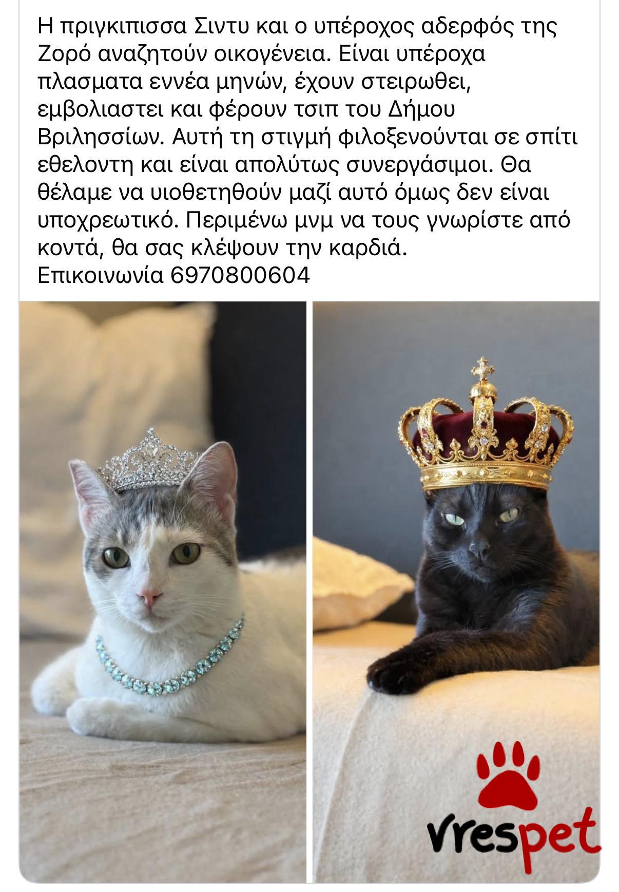 Στειρωμένοι, πλήρως εμβολιασμένοι και με τσιπ Δήμου Βριλησσίων, φιλοξενούνται σε σπίτι εθελοντή και είναι απόλυτα συνεργάσιμοι, ήρεμοι και καλοσυνάτοι.