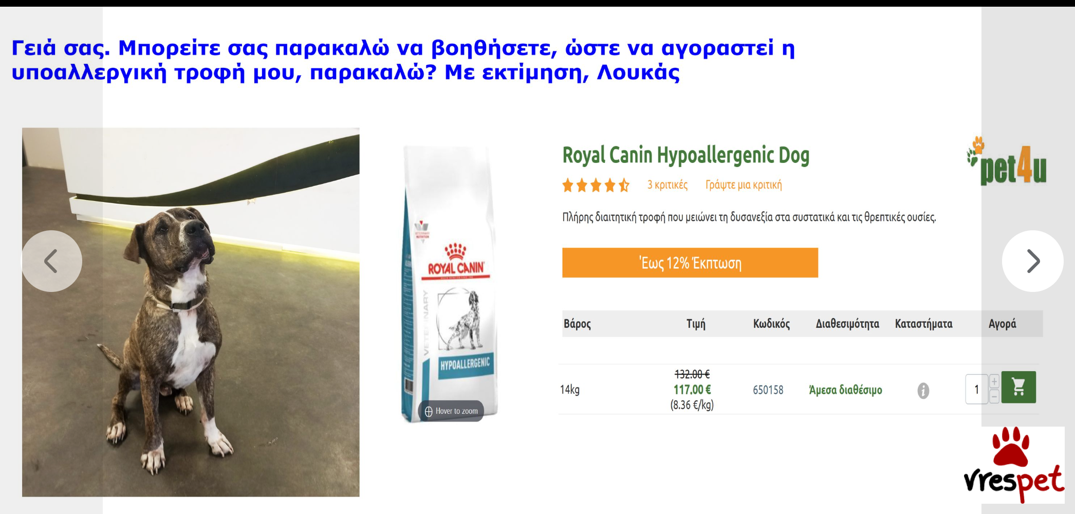 Η τροφή μου (Royal Canine Hypoallegenic 14 κιλά, από το pet shop 'Pet 4 you') κοστίζει τον μήνα 117ε.