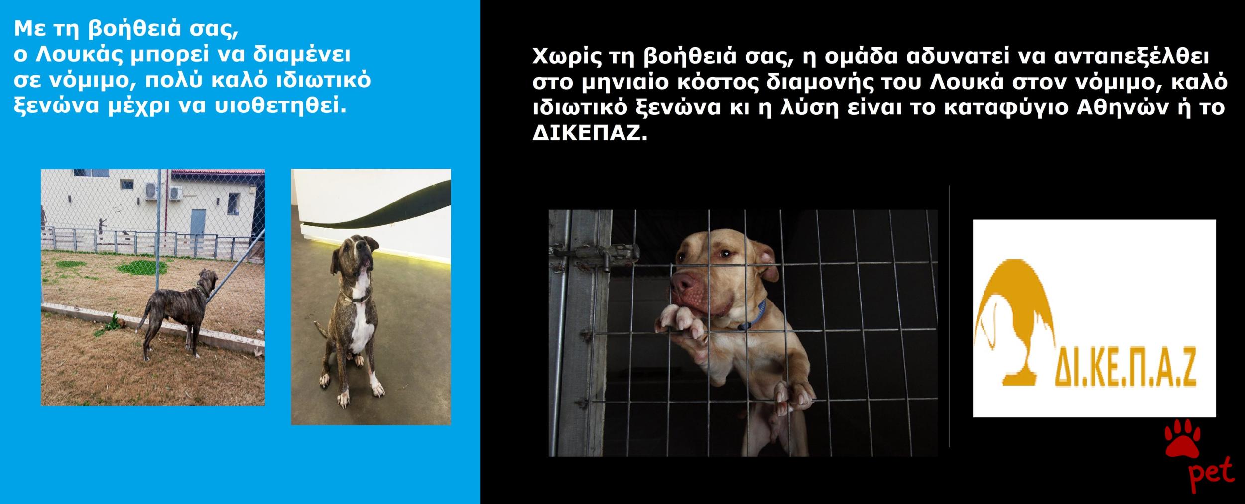 Αν δεν τα καταφέρουμε ο σκυλάκος θα πάει στο ΔΙΚΕΠΑΖ, μιας κι η ομάδα μας δε διαθέτει καταφύγιο και τα σπίτια μας έχουν κατοικίδια ζωάκια κι ο Λουκάς δε θέλει άλλα ζώα στο χώρο του.