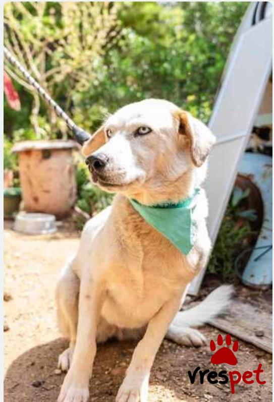 Our Zoe is 6 years old, weighs 20-25 kg, is spayed, vaccinated, and has spent her entire life at Vrouva Farm. She was found near death as a puppy, and we named her Zoe (which means "life" in Greek) so she could live. And live she did—she blossomed and became this wonderful creature. When you come to see her, she will hug you, kiss you, and look at you with her blue eyes as if to say, "Come, let's sing together." What do you say, shall we?
