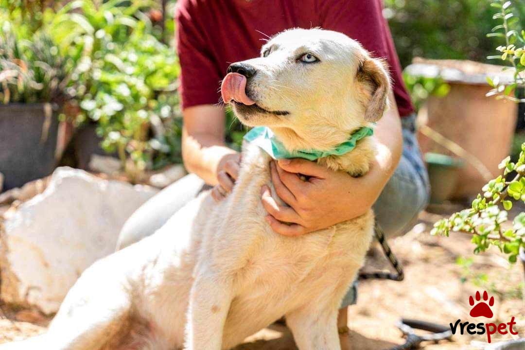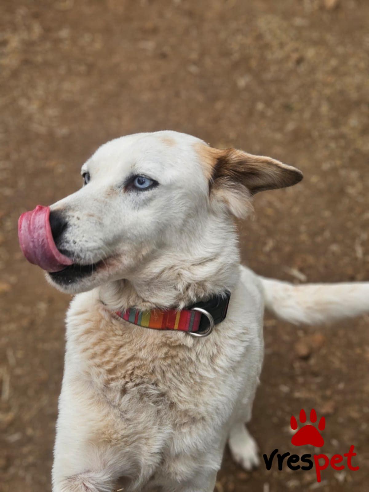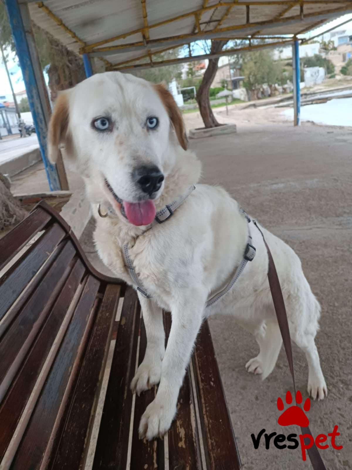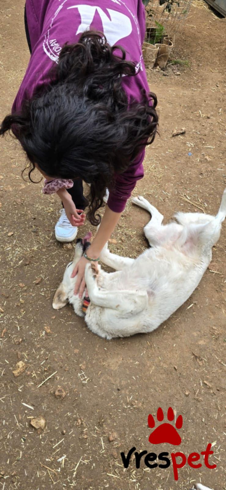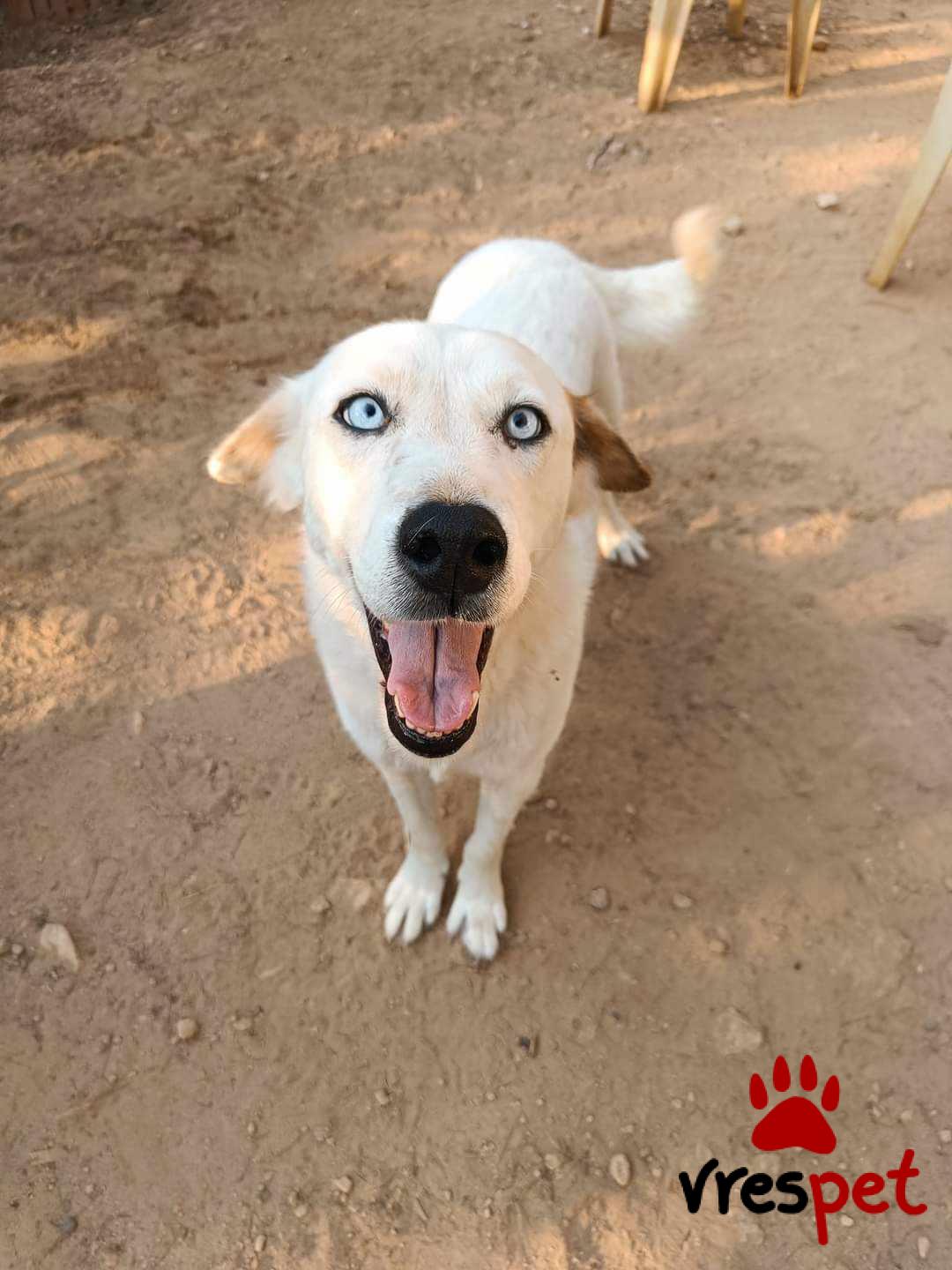Our Zoe is 6 years old, weighs 20-25 kg, is spayed, vaccinated, and has spent her entire life at Vrouva Farm. She was found near death as a puppy, and we named her Zoe (which means "life" in Greek) so she could live. And live she did—she blossomed and became this wonderful creature. When you come to see her, she will hug you, kiss you, and look at you with her blue eyes as if to say, "Come, let's sing together." What do you say, shall we?