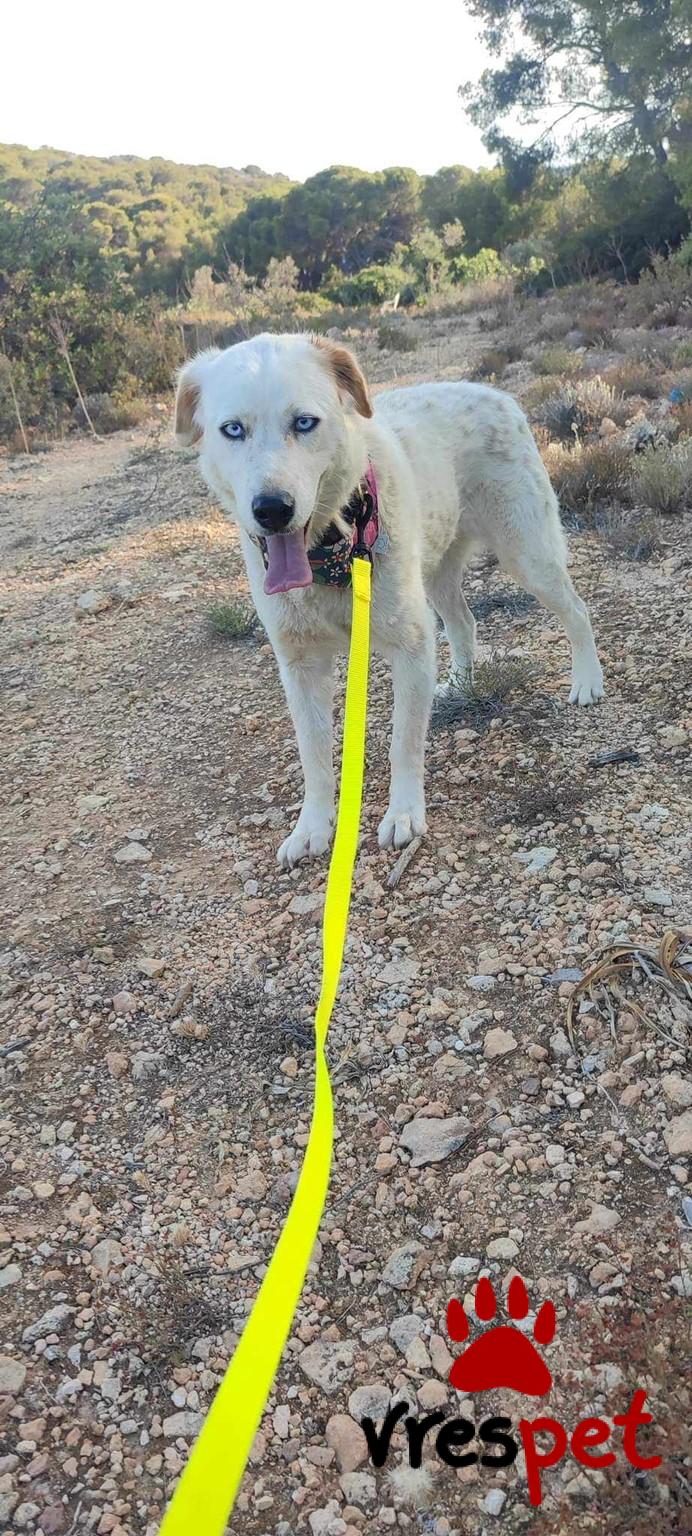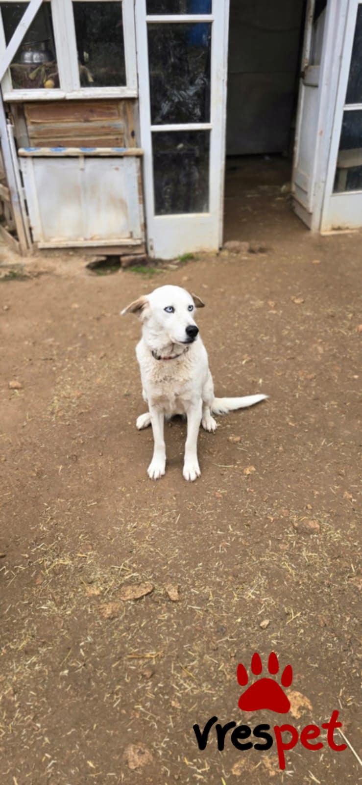 Our Zoe is 6 years old, weighs 20-25 kg, is spayed, vaccinated, and has spent her entire life at Vrouva Farm. She was found near death as a puppy, and we named her Zoe (which means "life" in Greek) so she could live. And live she did—she blossomed and became this wonderful creature. When you come to see her, she will hug you, kiss you, and look at you with her blue eyes as if to say, "Come, let's sing together." What do you say, shall we?